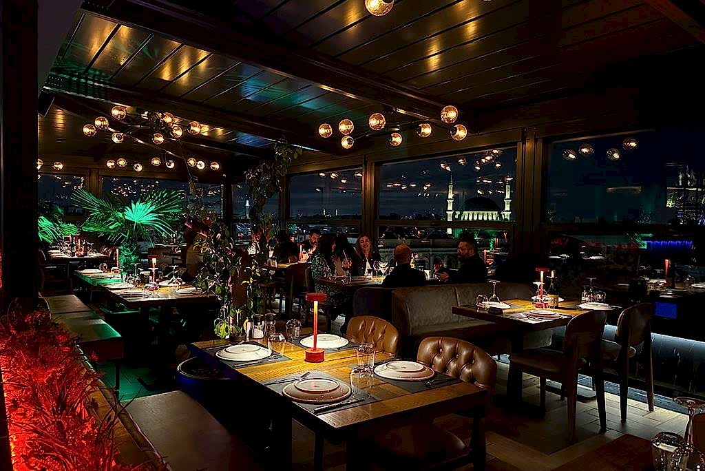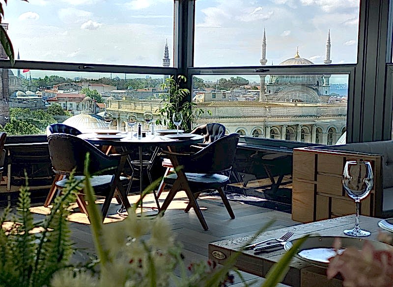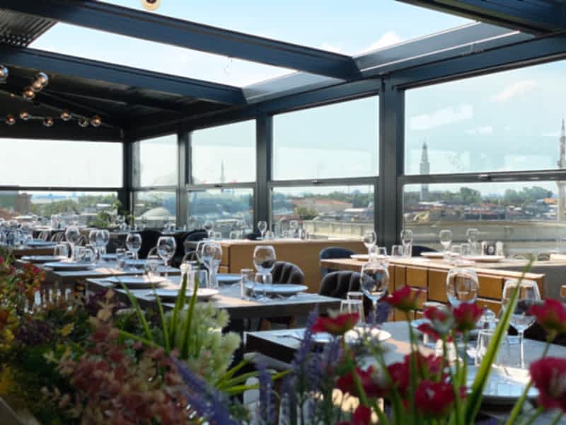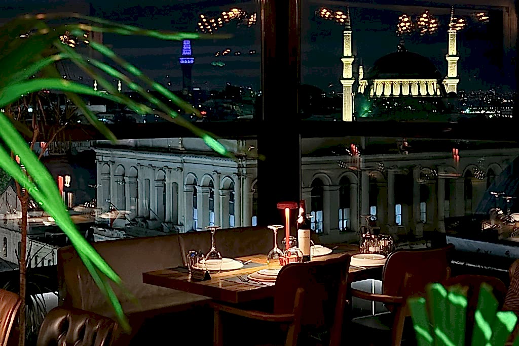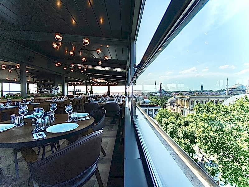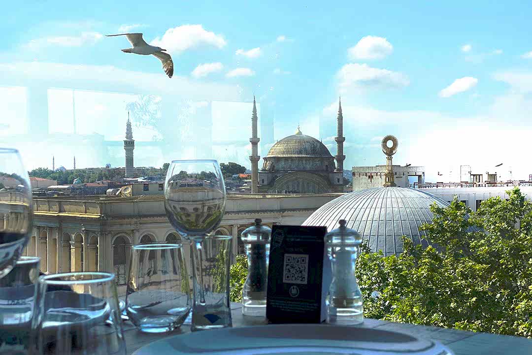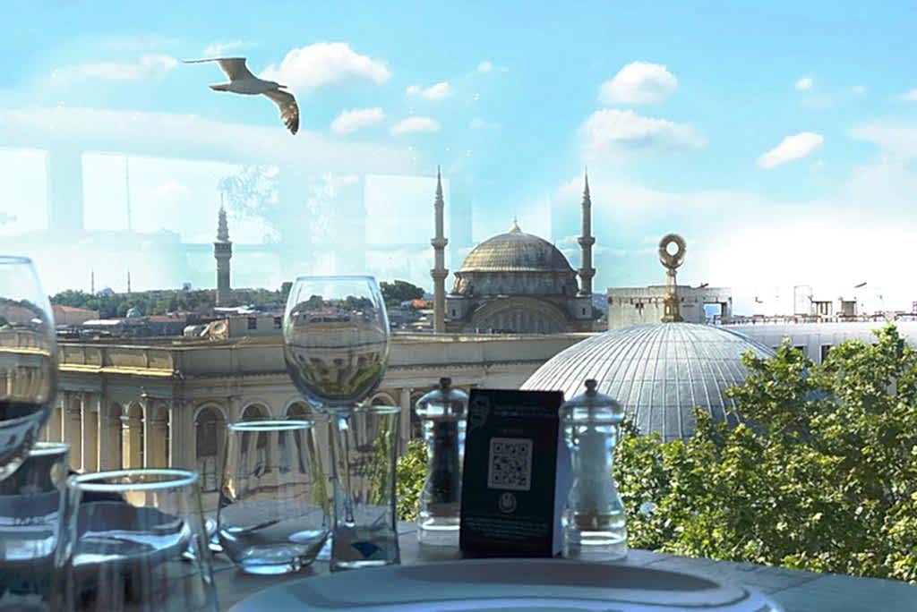 The 360-degree view from our roof-top restaurant offers an unparalleled view of Istanbul, including the minaret of Hagia Sophia, the Bosphorus strait, the Blue Mosque, and the Sea of Marmara.